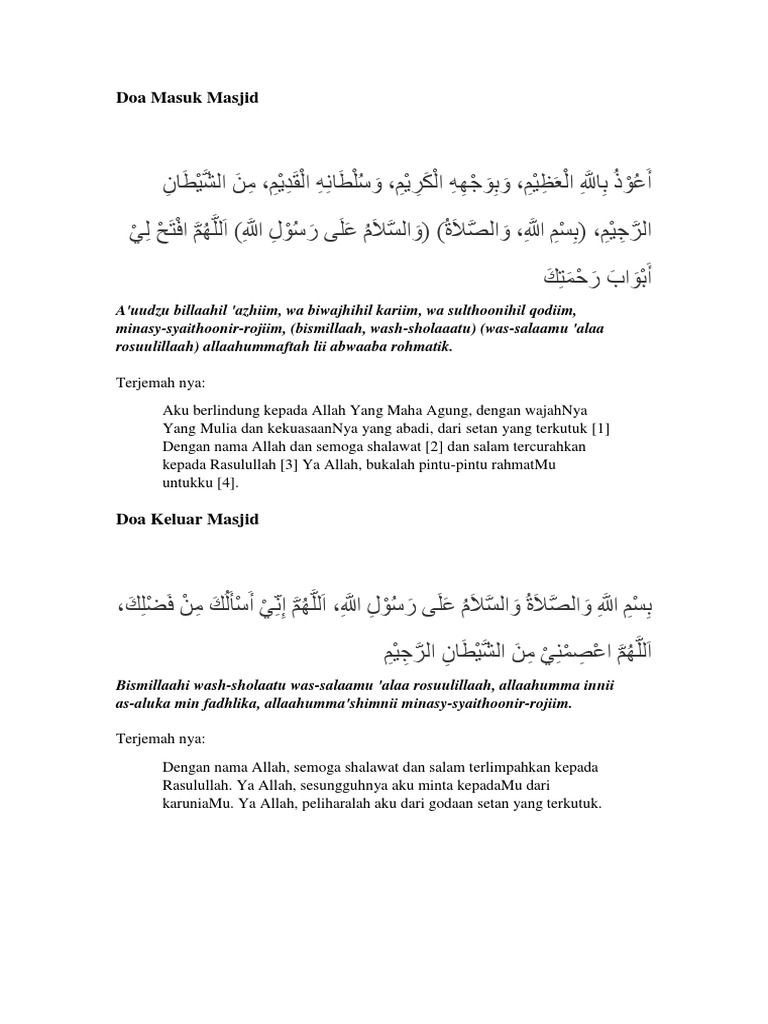 Doa masuk masjid. Wahai tuhanku sesungguhnya aku memohon kepada mu akan segala keutamaan mu. Termasuk ketika anda mau memasuki masjid. Bacaan doa masuk masjid dan keluar masjid bahasa arab latin dan artinya sebagai seorang muslim kita dianjurkan untuk selalu dekat dengan masjid dan senantiasa memakmurkannya.